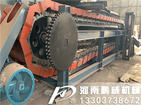 鏈板機(jī)結(jié)構(gòu)設(shè)計(jì)合理,使用性能好,運(yùn)行阻力小,易損零件少,操作安全,維修方便,運(yùn)行可靠,使用壽命長(zhǎng)。鏈板機(jī)可水平或傾角<30°安裝,傾斜安裝時(shí),配有棘輪逆止機(jī)構(gòu)。輸送鏈板上的輥輪在導(dǎo)軌上滾動(dòng),輸送鏈與機(jī)殼無磨擦;鏈條采用合金鋼熱處理加工制成,其正常使用壽命3年左右,運(yùn)行中故障率低。除頭尾軸承外,輸送機(jī)中無潤(rùn)滑點(diǎn)。鏈板機(jī)由頭部機(jī)架、頭部護(hù)罩、主動(dòng)鏈輪組、輸料裝置、中部機(jī)架、尾部機(jī)架、改向鏈輪組,鏈板托輪組和驅(qū)動(dòng)裝置組成。驅(qū)動(dòng)裝置由柱銷聯(lián)軸器、JZQ減速機(jī)、驅(qū)動(dòng)底座組成。分右裝和左裝兩種,從機(jī)尾向輸送方向看,驅(qū)動(dòng)裝置在右側(cè)為右裝,在左側(cè)為左裝。鏈輪采用組裝式結(jié)構(gòu),由鑄鋼鏈輪圈與鏈輪芯用螺栓聯(lián)結(jié)組合,耐磨性能強(qiáng),便于拆卸安裝。主動(dòng)鏈輪采用窩眼鏈輪圈,防止環(huán)鏈運(yùn)行中滑動(dòng)。