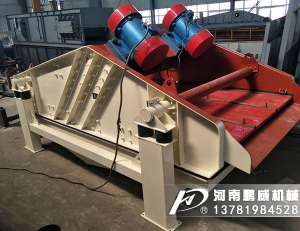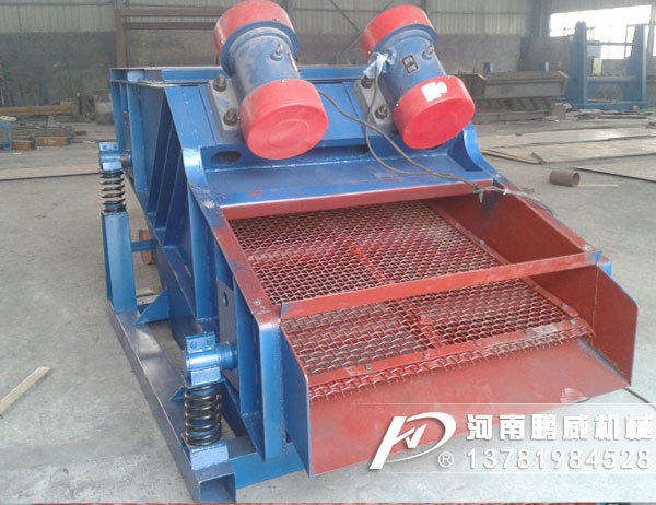 主要由篩箱、激振器、支承系統及電機組成。兩個互不聯系的振動器作同步反向運轉,兩組偏心質量產生的離心力沿振動方向的分力疊加,反向離心抵消,從而形成單一的沿振動方向的激振動,使篩箱做作往復直線運動。
