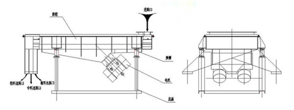 主要由篩箱、篩框、篩網、振動電機、電機臺座、減振彈簧、支架等組成。