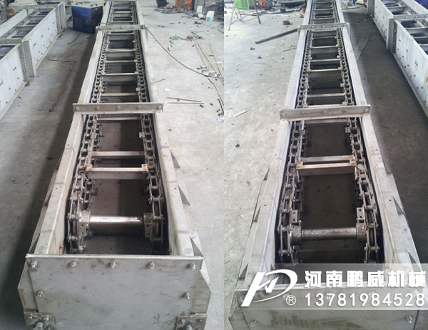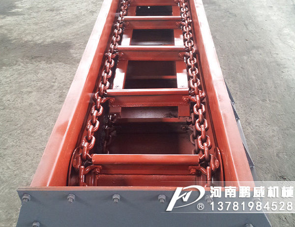 刮板輸送機的工作原理是,將敞開的溜槽,作為煤炭、矸石或物料等的承受件,將刮板固定在鏈條上(組成刮板鏈),作為牽引構(gòu)件。當(dāng)機頭傳動部啟動后,帶動機頭軸上的鏈輪旋轉(zhuǎn),使刮板鏈循環(huán)運行帶動物料沿著溜槽移動,直至到機頭部卸載。刮板鏈繞過鏈輪作無級閉合循環(huán)運行,完成物料的輸送。